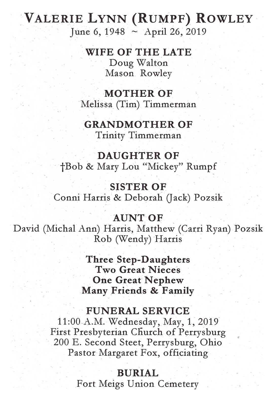 Rowley, Valerie - Remembrance Card, Witzler Shank Funeral Home, Perrysburg, OH