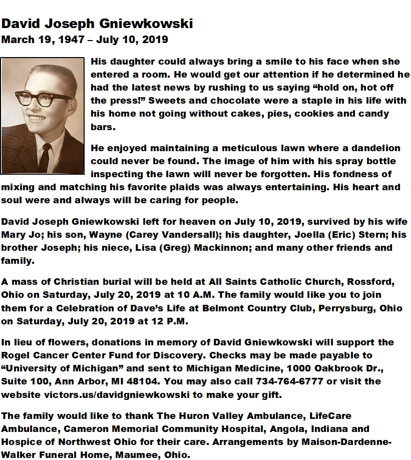 Gniewkowski, David - Obituary pg 1, Maison-Dardenne-Walker Funeral Home, Maumee, OH