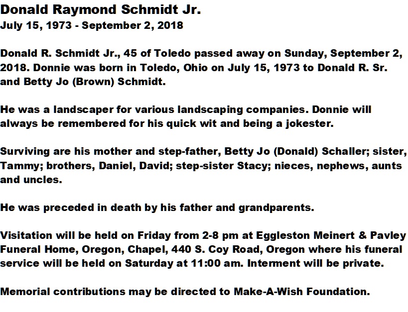 Schmidt Jr, Donald - Obituary, Eggleston Meinert Pavley Funeral Home, Oregon, OH