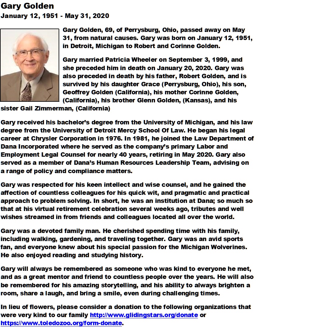 Golden, Gary - Obituary, Witzler Shank Funeral Home, Perrysburg, OH