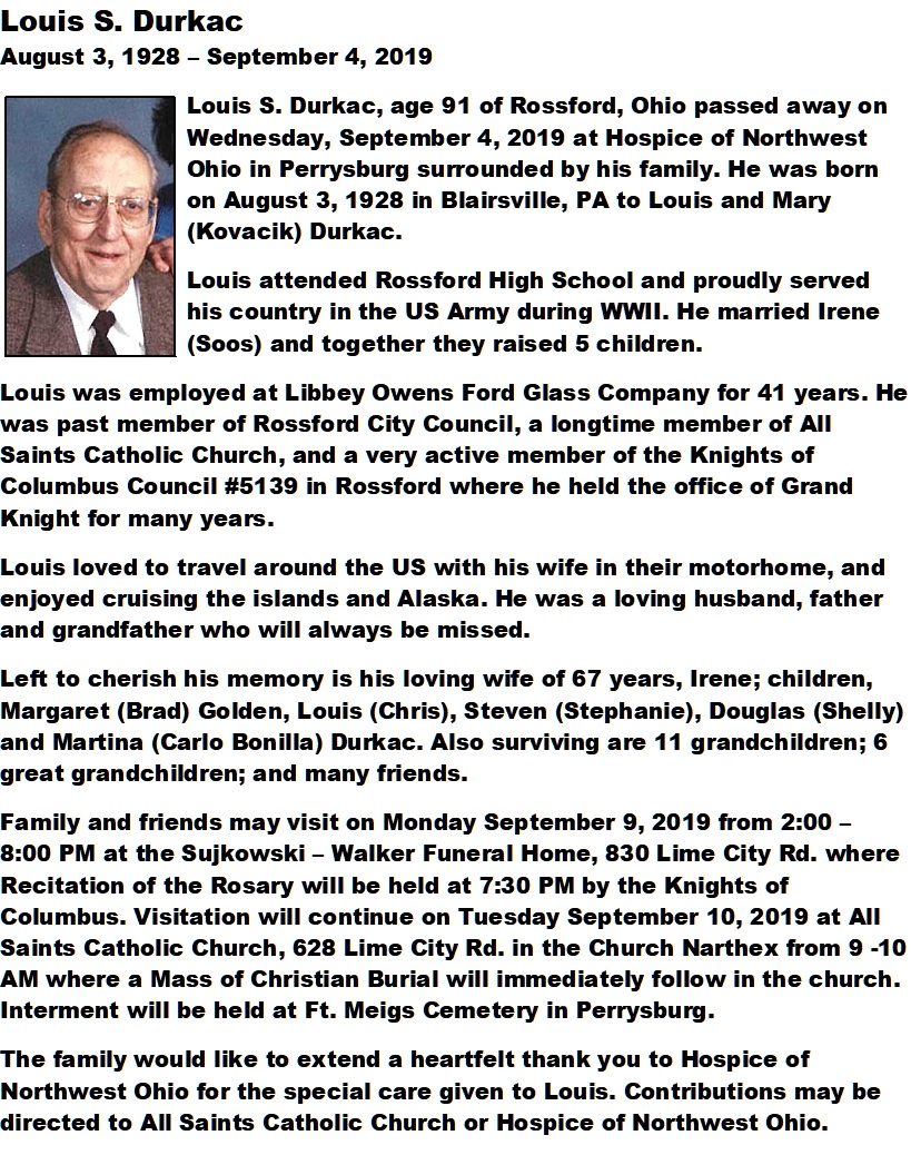 Durkac, Louis - Obituary, Sujkowski-Walker Funeral Home, Rossford, OH