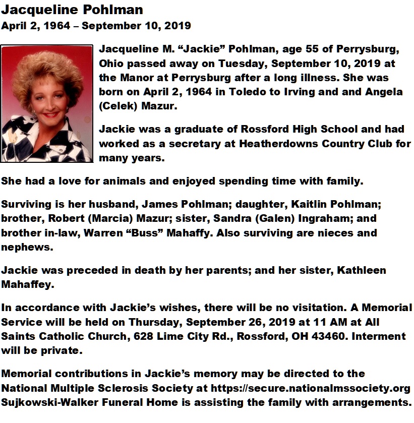 Pohlman, Jacqueline - Obituary, Sujkowski-Walker Funeral Home, Rossford, OH