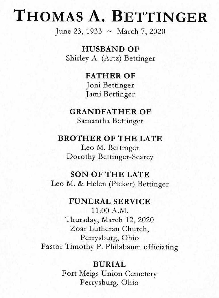 Bettinger, Thomas - Obituary pg 1, Witzler Shank Funeral Home, Perrysburg, OH