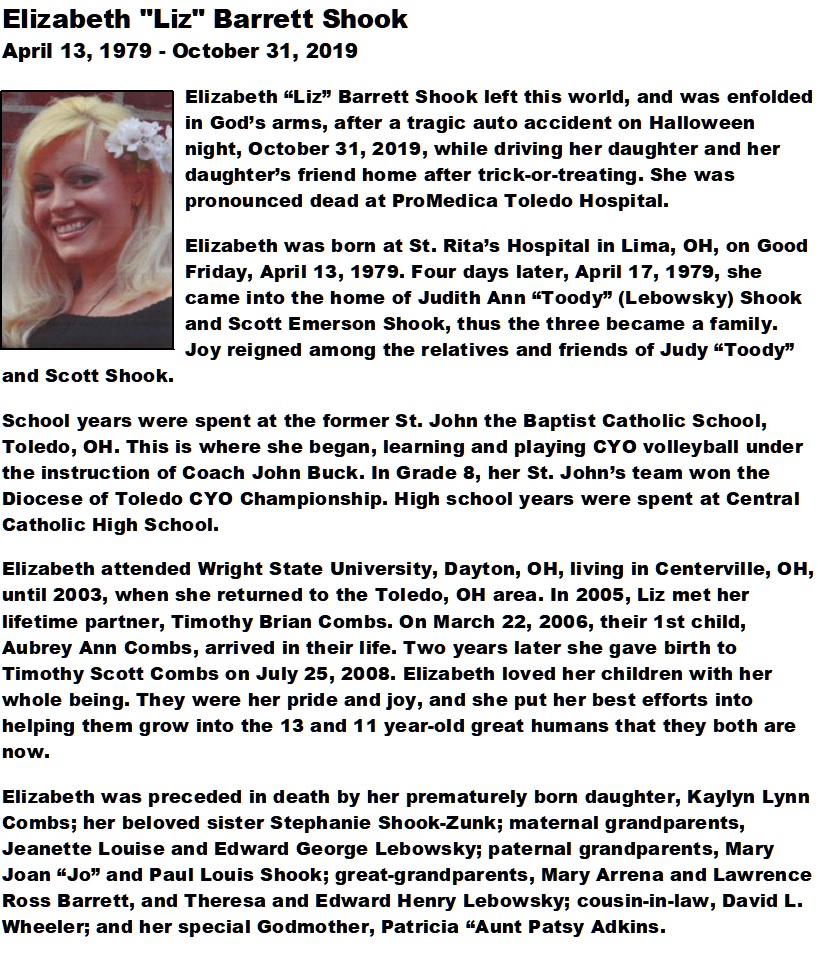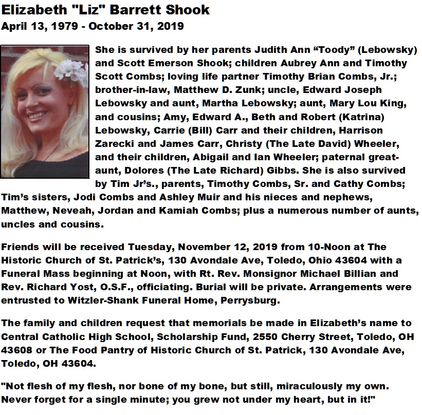 Shook, Elizabeth - Obituary pg 1, Witzler Shank Funeral Home, Perrysburg, OH