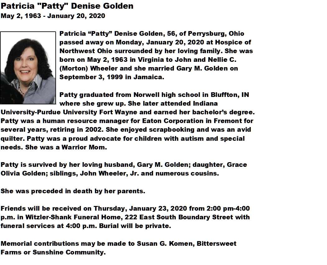 Golden, Patricia - Obituary, Witzler Shank Funeral Home, Perrysburg, OH
