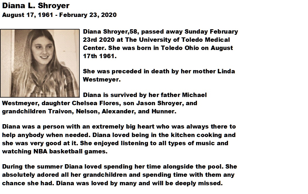 Shroyer, Diana - Obituary, Walter Funeral Home, Toledo, OH