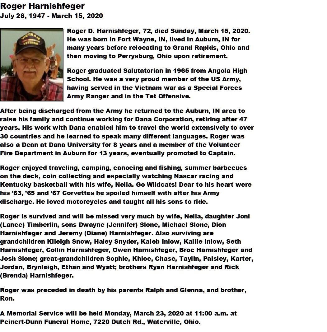 Harnishfeger, Roger - Obituary, Peinert-Dunn Funeral Home, Waterville, OH