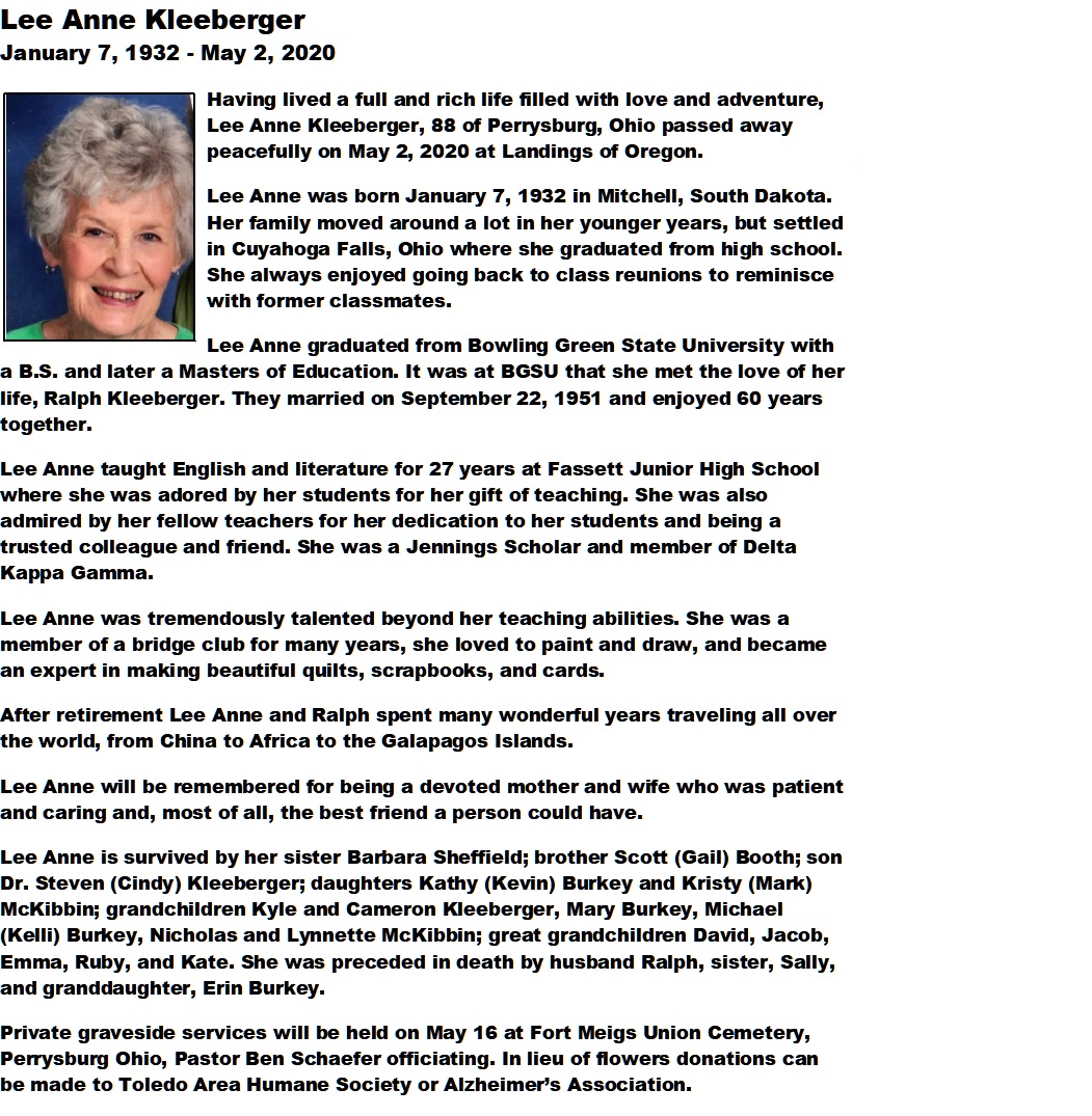 Kleeberger, Lee Anne - Obituary, Witzler Shank Funeral Home, Perrysburg, OH