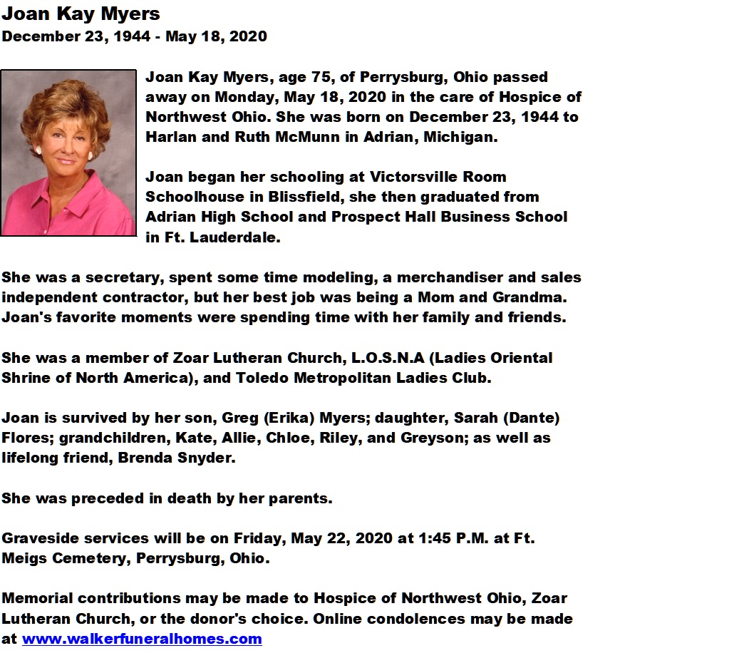 Myers, Joan - Obituary, Maison-Dardenne-Walker Funeral Home, Maumee, OH