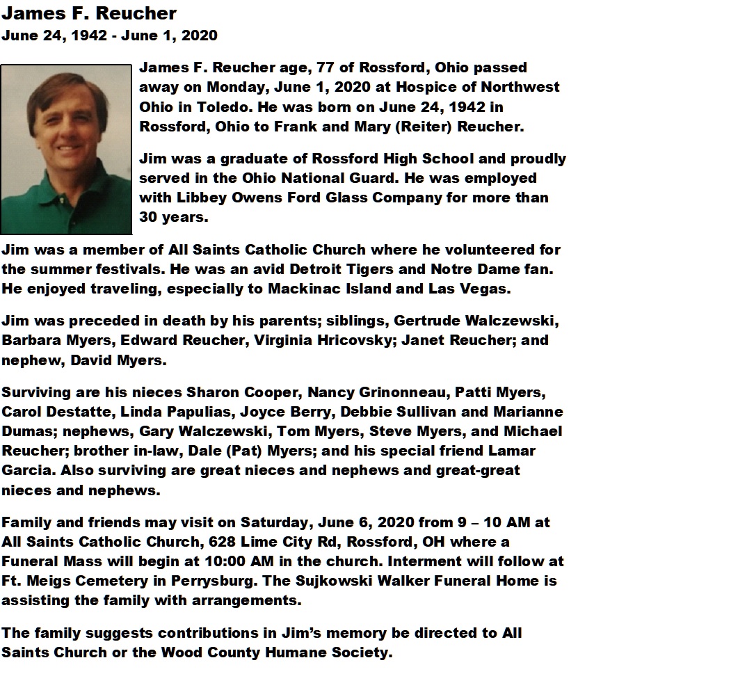 Reucher, James - Obituary, Sujkowski-Walker Funeral Home, Rossford, OH
