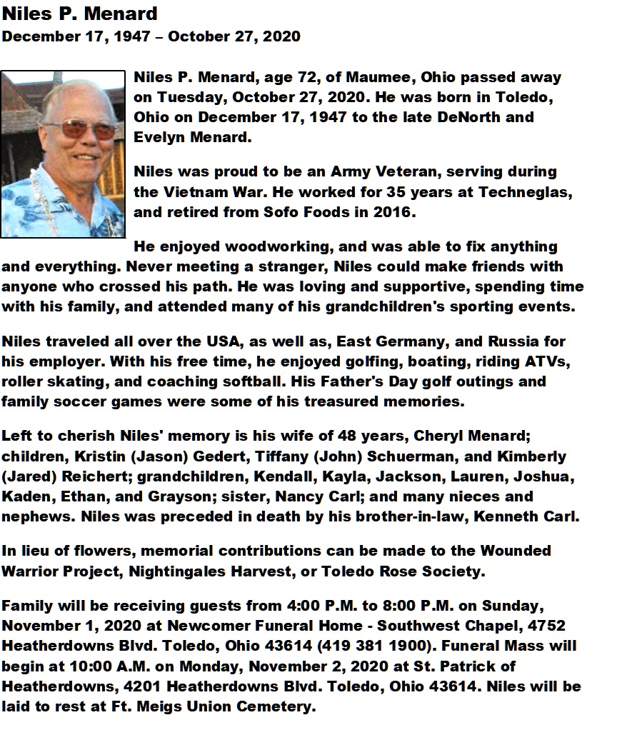 Menard, Niles - Obituary, Newcomer Funeral Home - SW Chapel, Toledo, OH