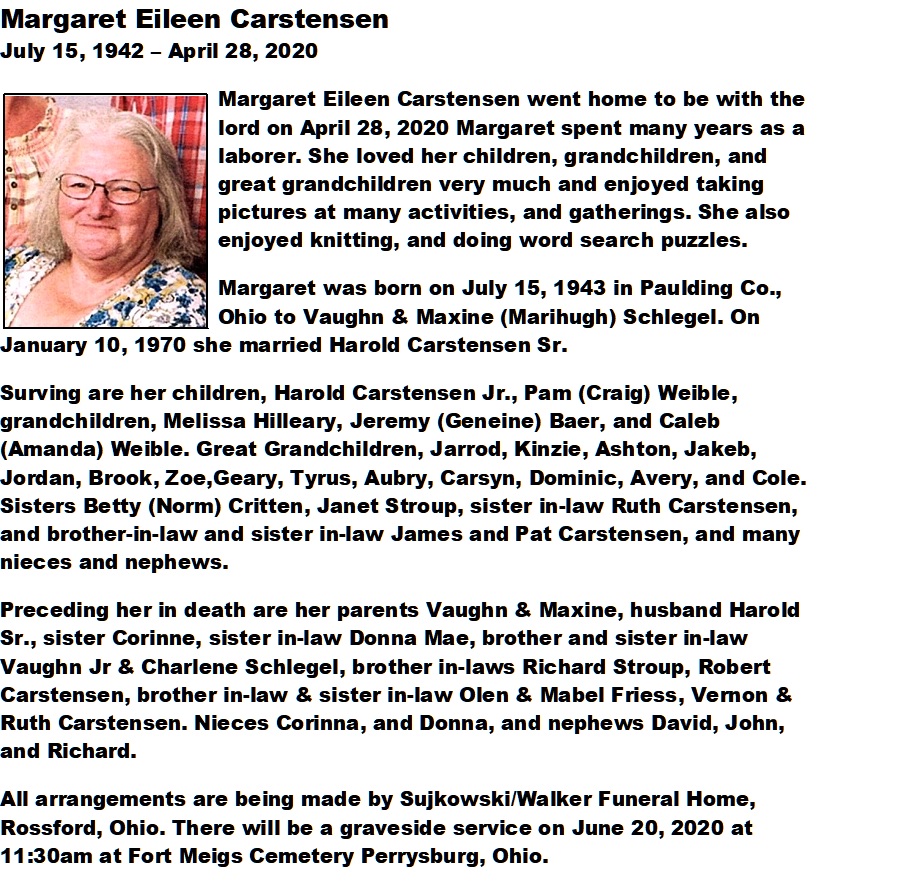 Carstensen, Margaret - Obituary, Sujkowski Walker Funeral Home, Rossford, OH