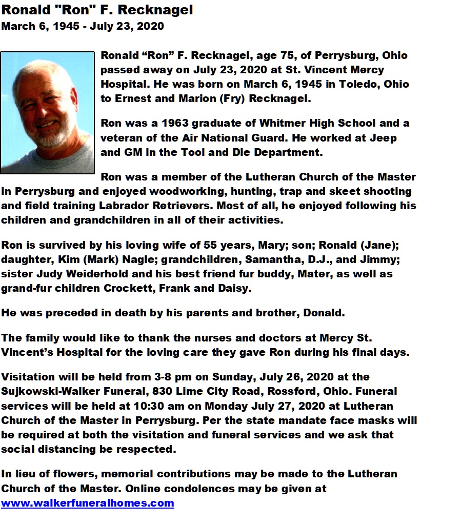 Recknagel, Ronald - Obituary, Sujkowski Walker Funeral Home, Rossford, OH