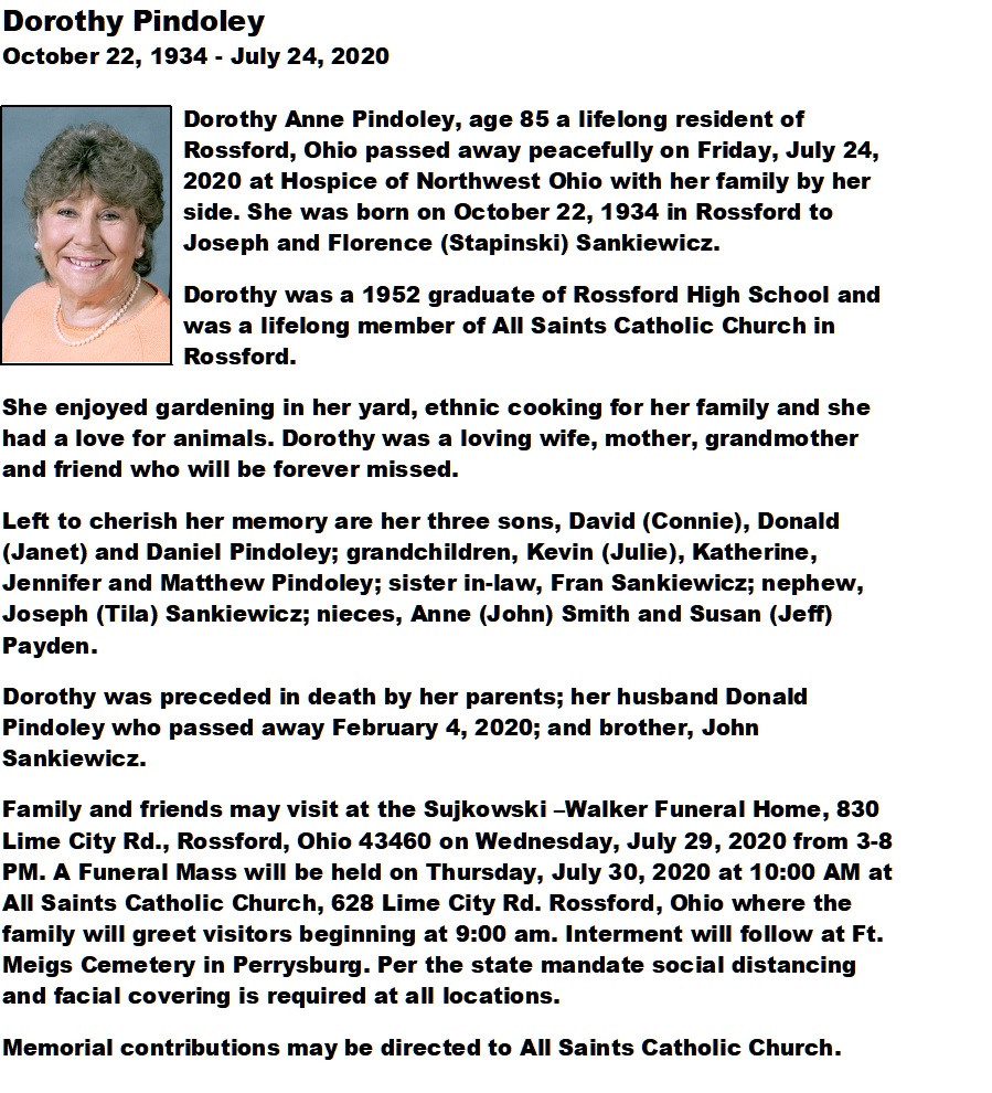 Pindoley, Dorothy - Obituary, Sujkowski Walker Funeral Home, Rossford, OH