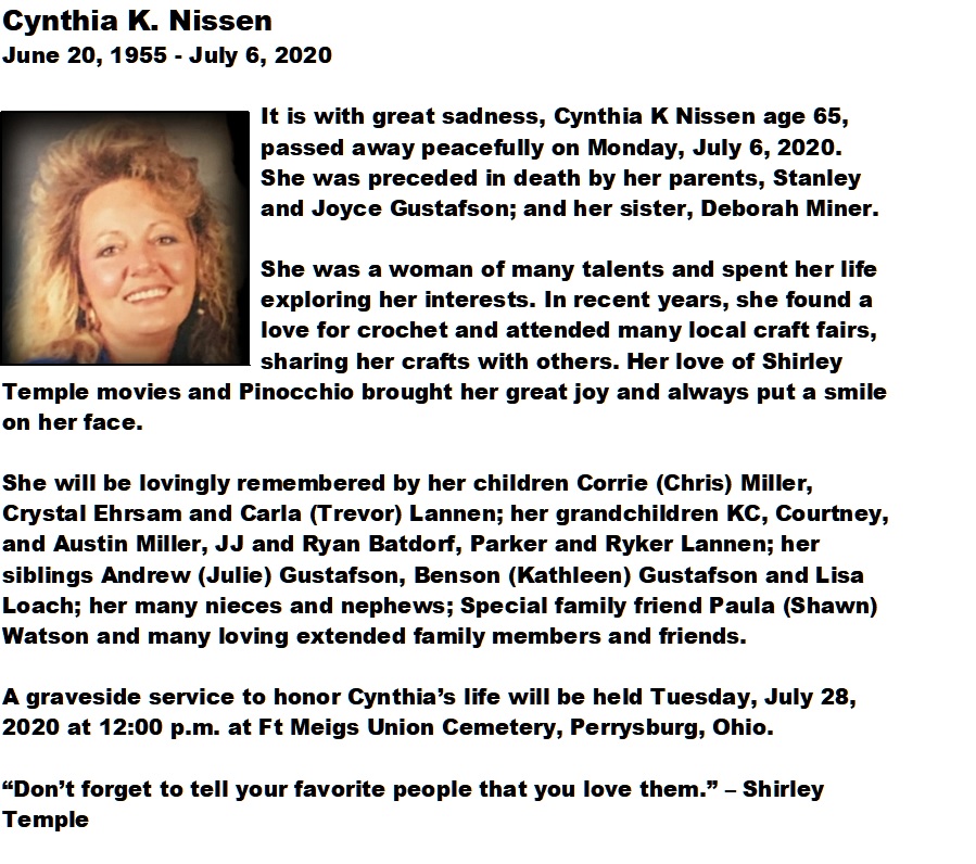 Nissen, Cynthia - Obituary, Cremation Society of Toledo, Toledo, OH