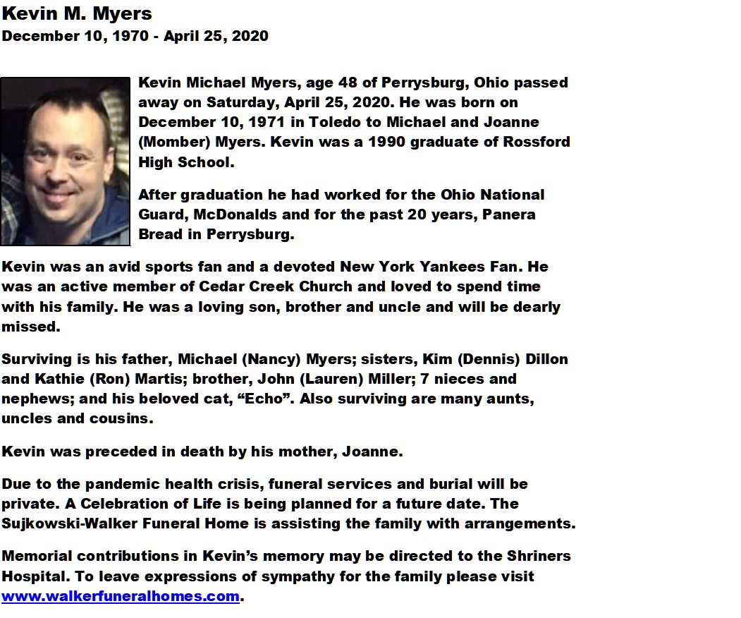 Myers, Kevin - Obituary, Sujkowski Walker Funeral Home, Rossford, OH