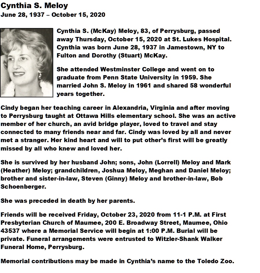 Meloy, Cynthia - Obituary, Witzler Shank Walker Funeral Home, Perrysburg, OH