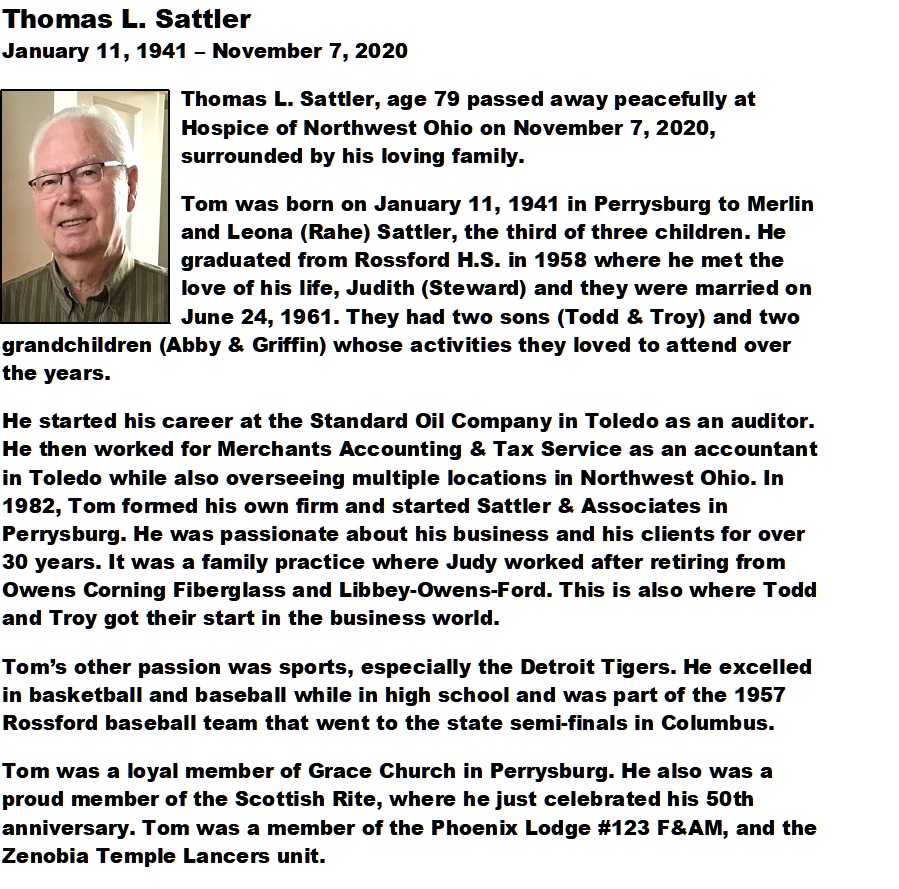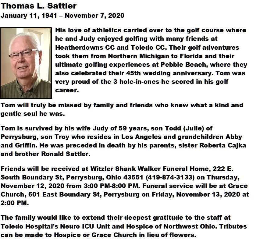 Sattler, Thomas - Obituary pg 1, Witzler Shank Walker Funeral Home, Perrysburg, OH