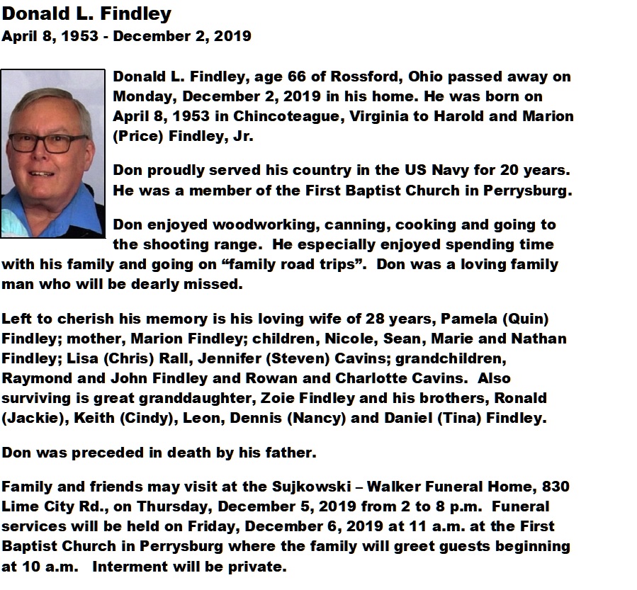 Findley, Donald - Obituary, Sujkowski Walker Funeral Home, Rossford, OH