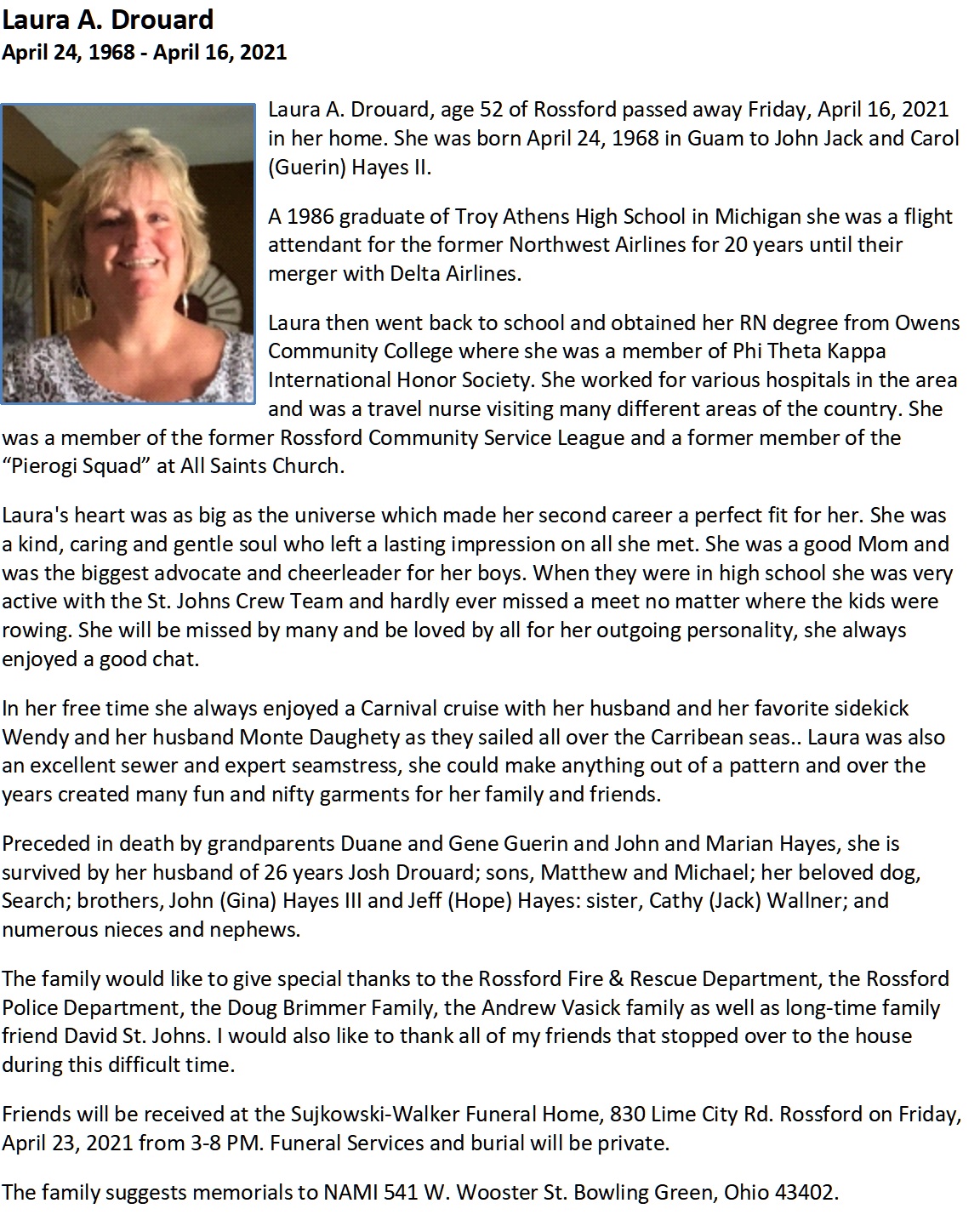 Drouard, Laura - Obituary, Sujkowski Walker Funeral Home, Rossford, OH
