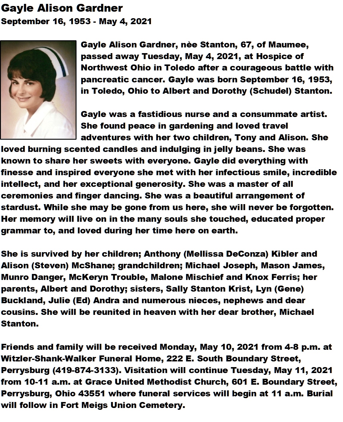 Gardner, Gayle - Obituary, Witzler Shank Walker Funeral Home, Perrysburg, OH
