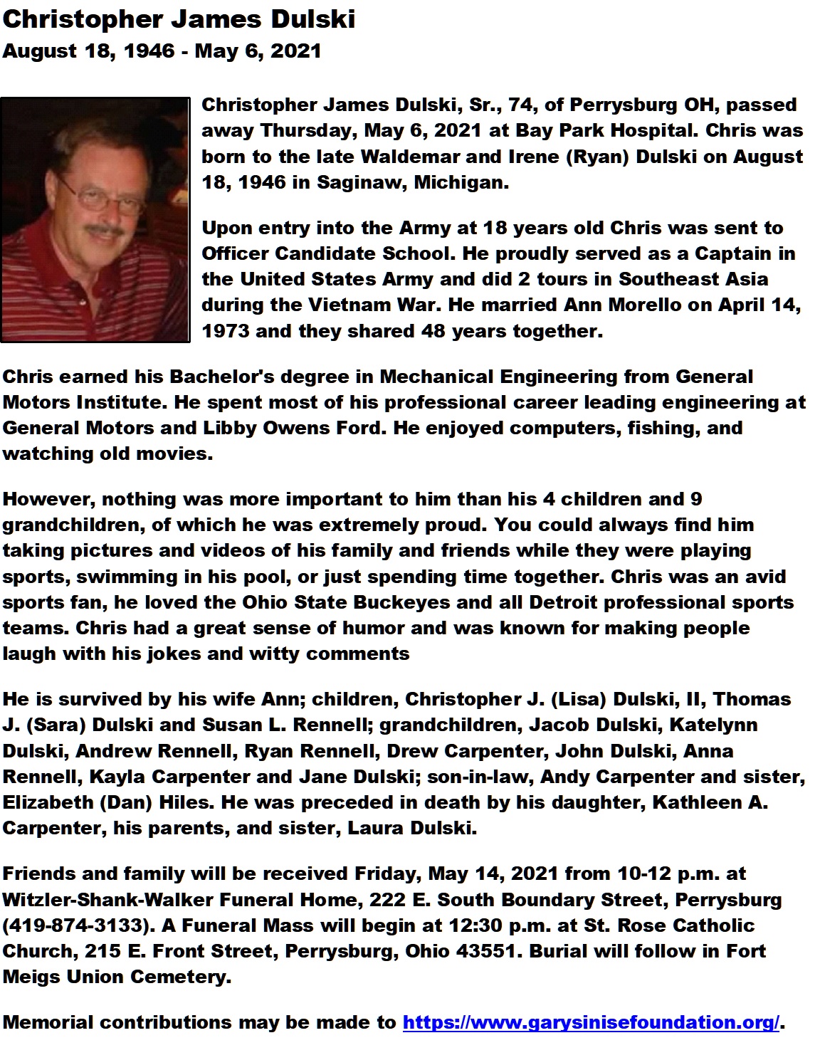 Dulski Sr, Christopher - Obituary, Witzler Shank Walker Funeral Home, Perrysburg, OH
