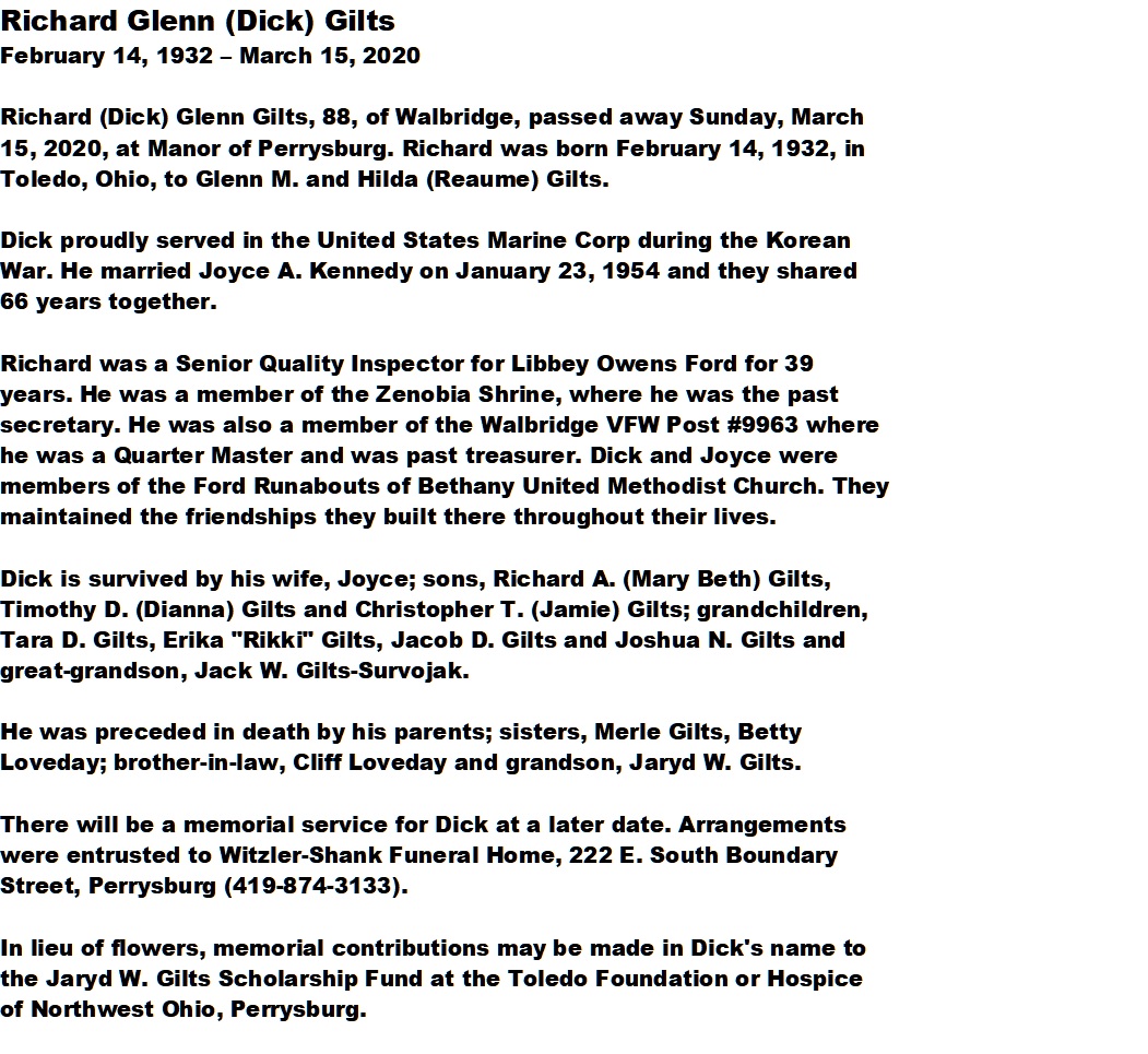 Gilts, Richard - Obituary, Witzler Shank Walker Funeral Home, Perrysburg, OH