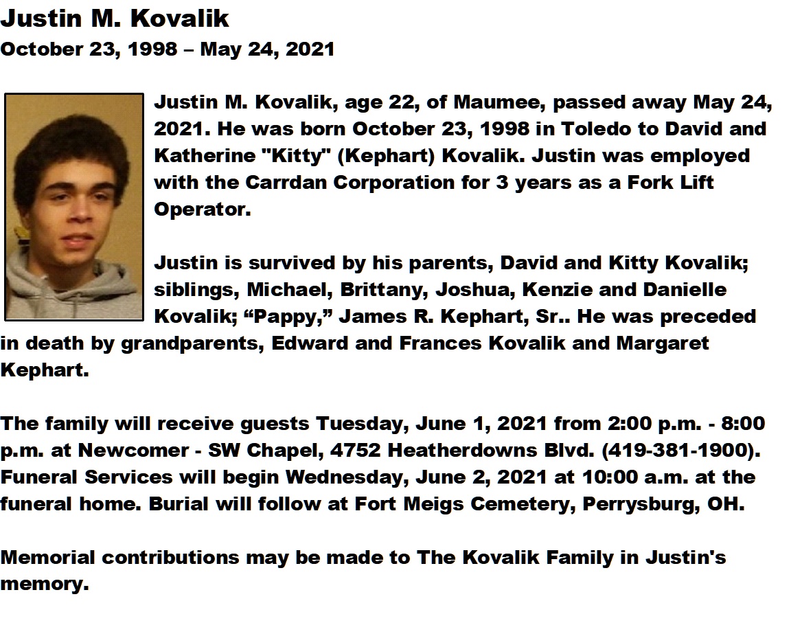 Kovalik, Justin - Obituary, Newcomer Funeral Home, SW Chapel, Toledo, OH
