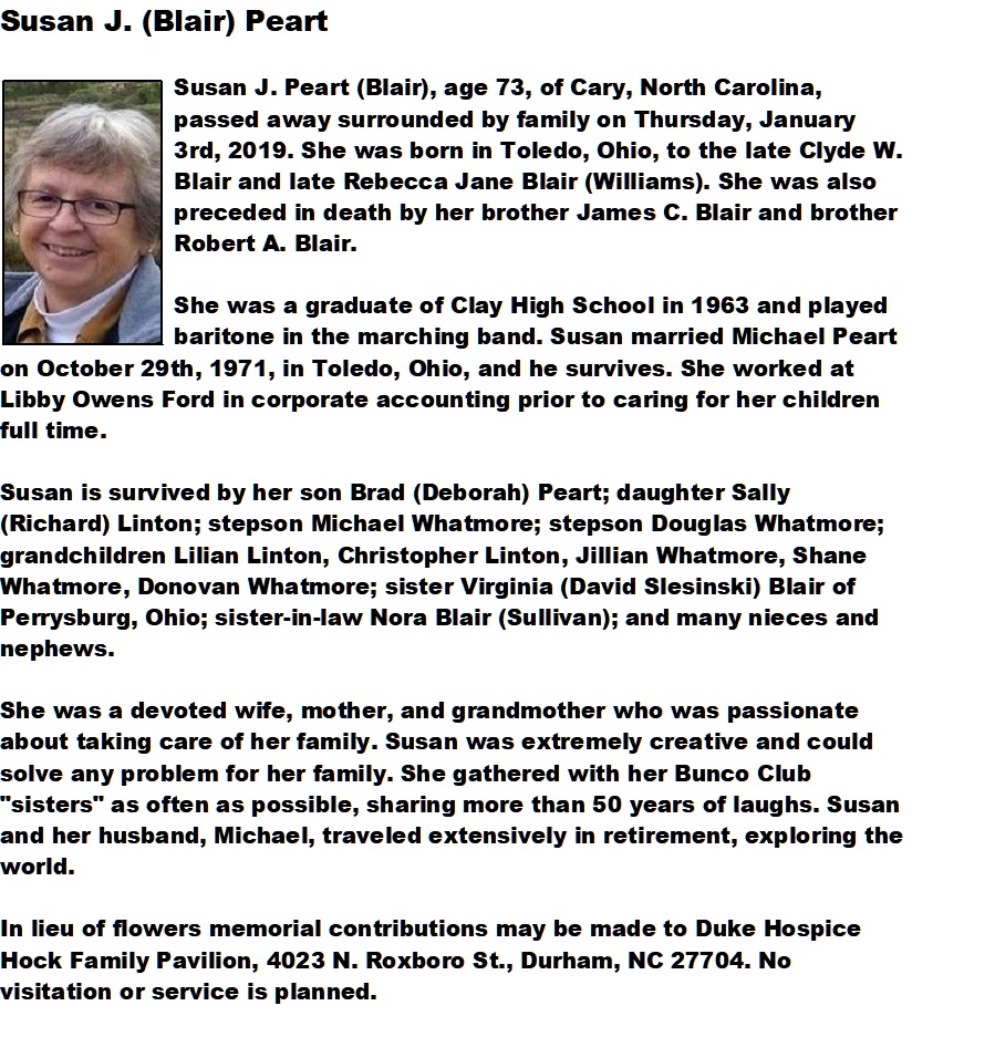 Peart, Susan - Obituary, Pope Crematory, Raleigh, North Carolina