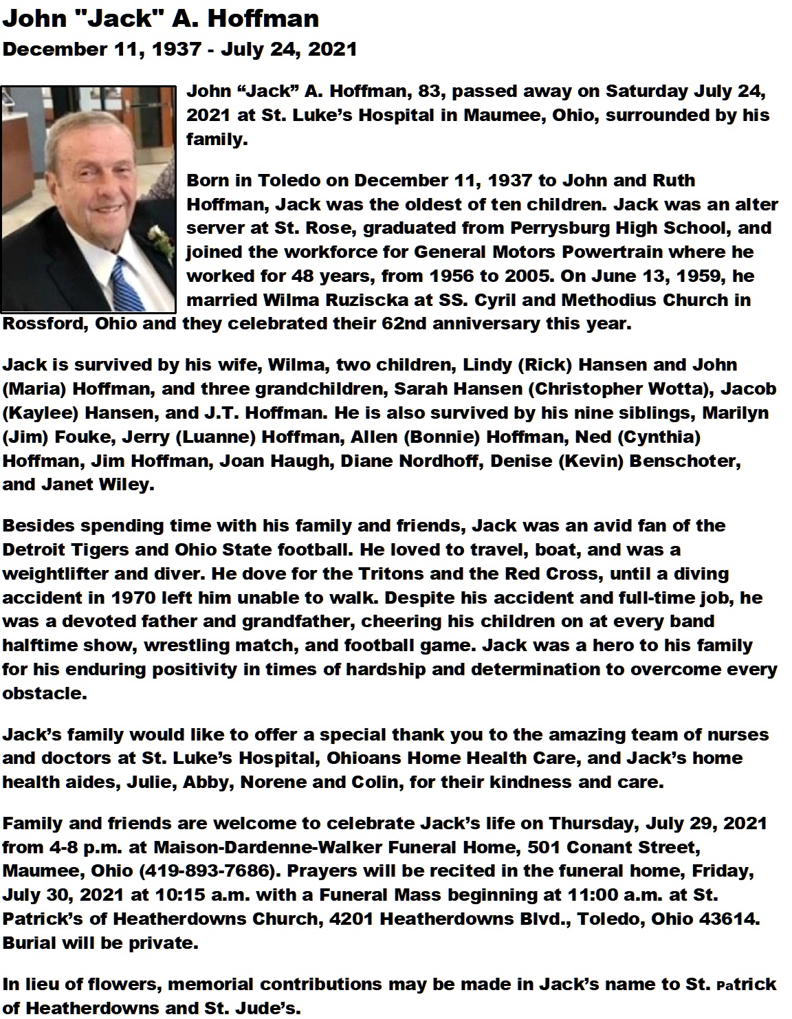 Hoffman, John (Jack) - Obituary, Maison Dardenne Walker Funeral Home, Maumee, Ohio