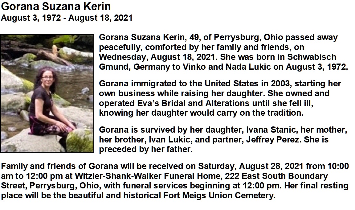 Kerin, Gorana - Obituary, Witzler Shank Walker Funeral Home, Perrysburg, OH