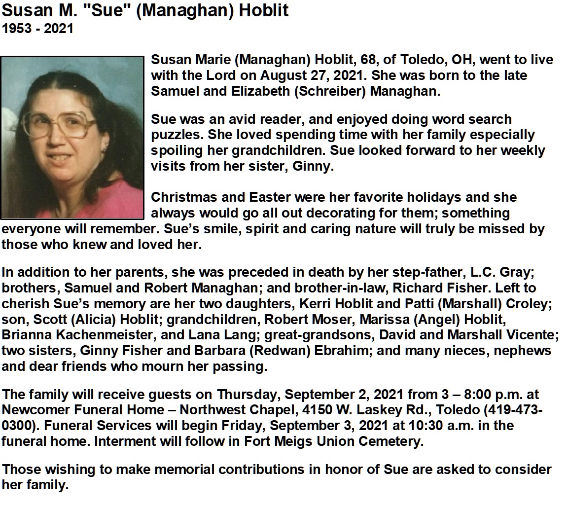Hoblit, Susan - Obituary, Newcomer Funeral Home - NW Chapel, Toledo, OH