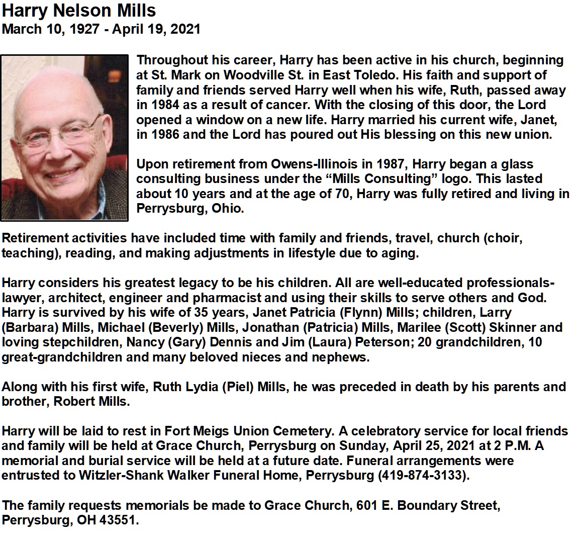 Mills Jr, Harry - Obituary pg 1, Witzler Shank Walker Funeral Home, Perrysburg, OH