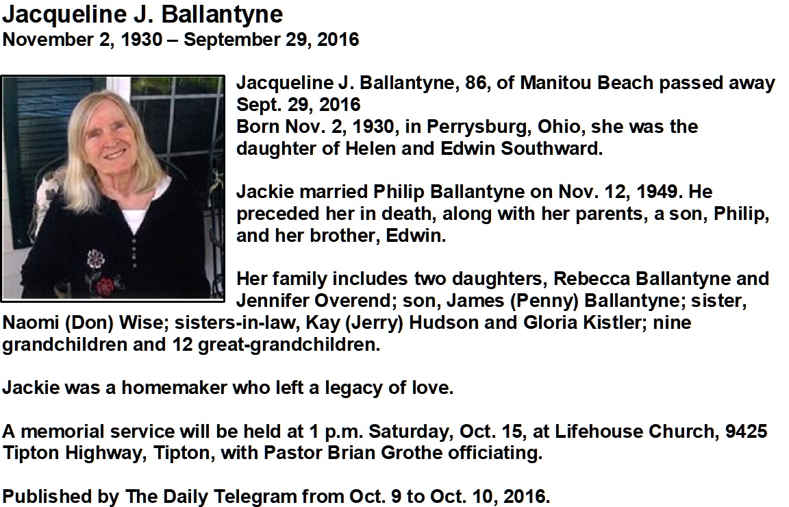 Ballantyne, Jacqueline - Obituary, Purse Funeral Home, Adrian, MI
