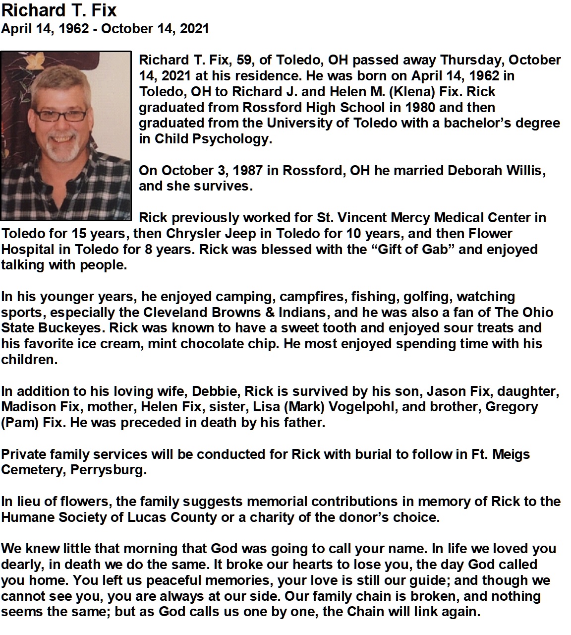 Fix, Richard T - Obituary, Sujkowski Walker Funeral Home, Rossford, OH