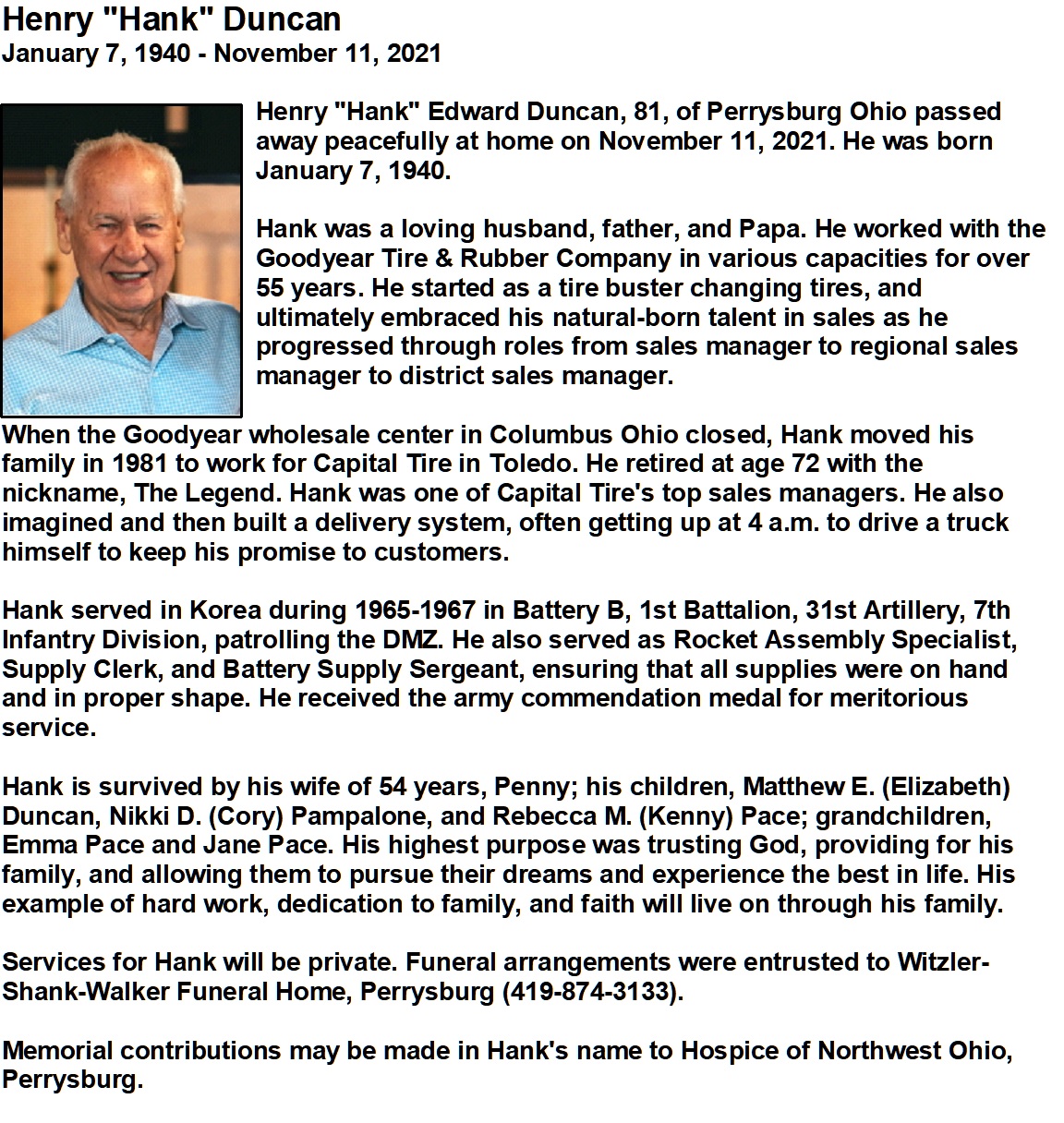 Duncan, Henry - Obituary, Witzler Shank Walker Funeral Home, Perrysburg, OH