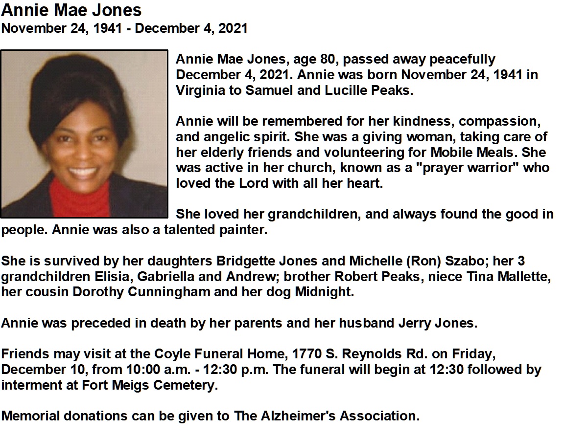 Jones, Annie - Obituary, Coyle Funeral Home, Toledo, OH
