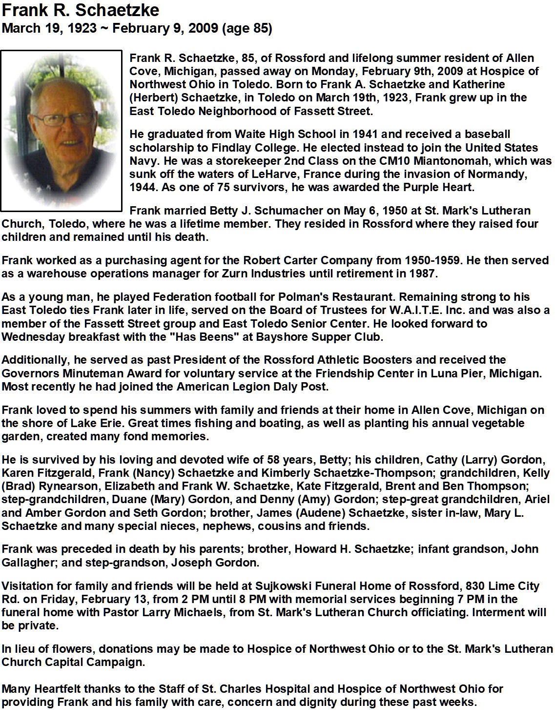 Schaetzke, Frank - Obituary, Sujkowski-Walker Funeral Home, Rossford, OH