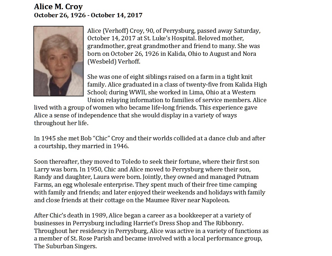 Croy, Alice - Obituary pg 2, Witzler Shank Funeral Home, Perrysburg, OH