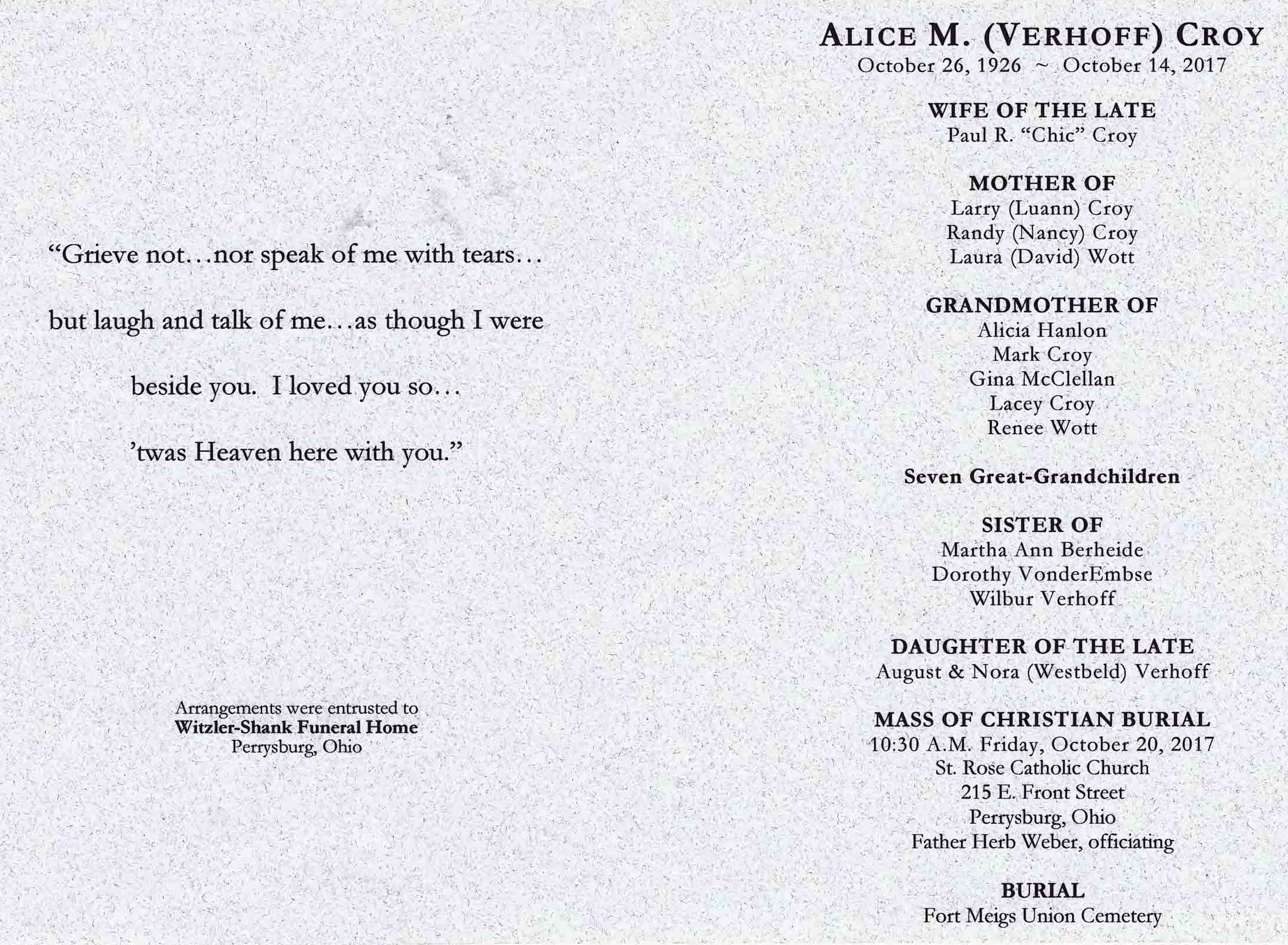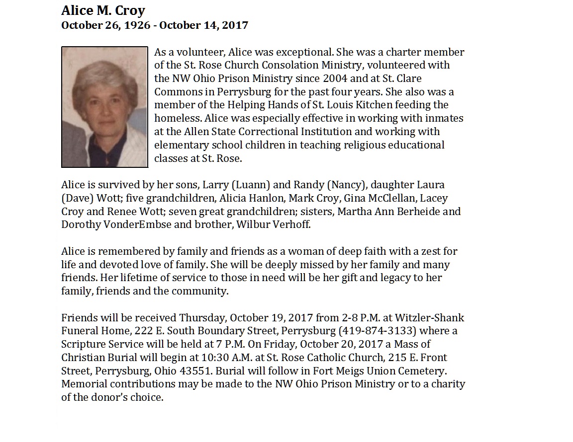 Croy, Alice - Obituary pg 1, Witzler Shank Funeral Home, Perrysburg, OH