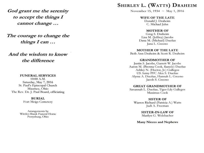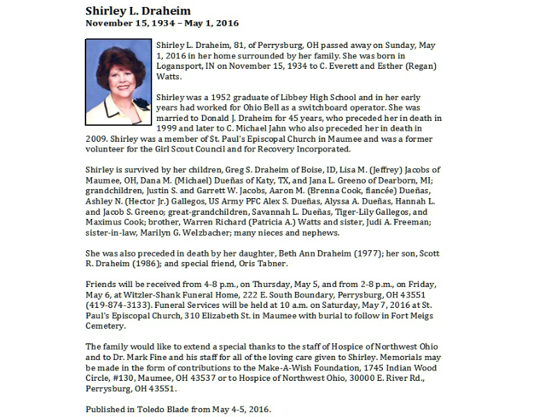 Draheim, Shirley - Obituary, Witzler Shank Funeral Home, Perrysburg, OH Published in Toledo Blade; 05/4-5/2016