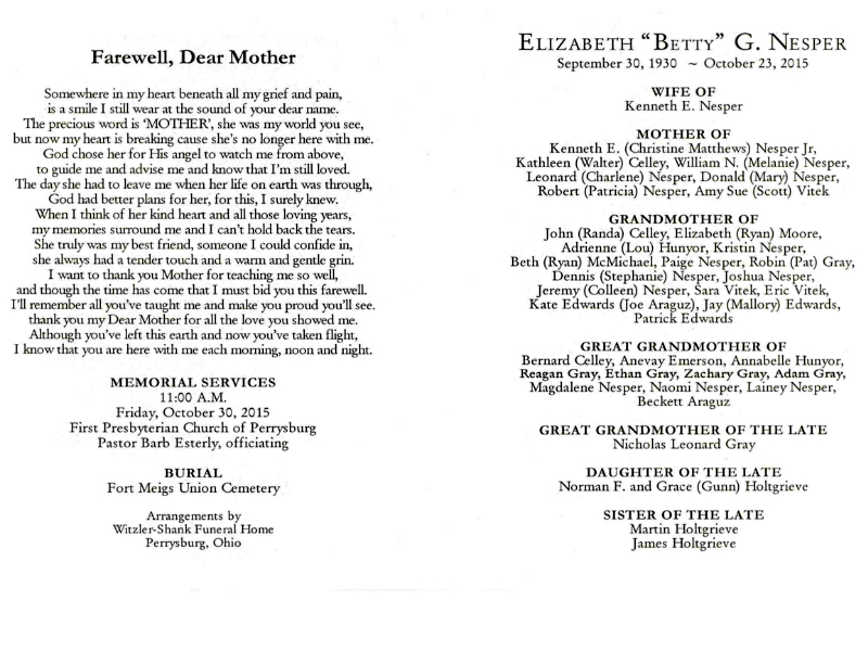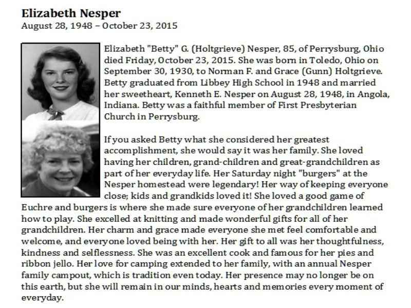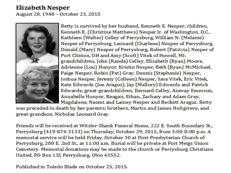 Nesper, Elizabeth - Obituary pg 2, Witzler Shank Funeral Home, Perrysburg, OH Published in the Toledo Blade; 10/25/2015
