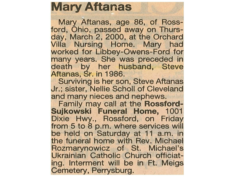 Aftanas, Mary, Sujkowski Funeral Home, Rossford, OH