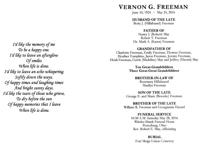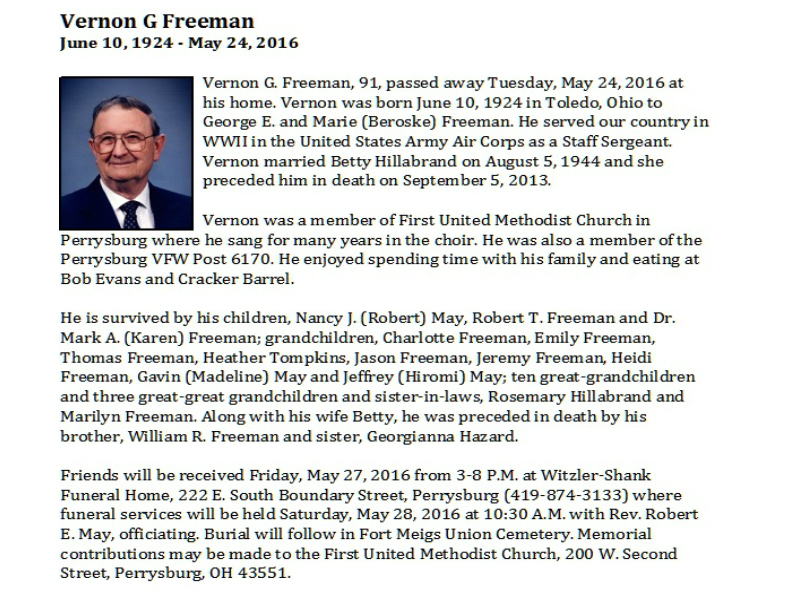 Freeman, Vernon - Obituary, Witzler Shank Funeral Home, Perrysburg, OH Published in the Toledo Blade; 05/26/2016