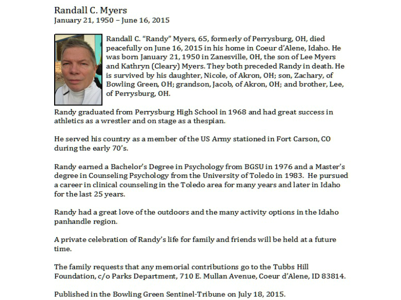 Myers, Randall, English Funeral Chapel, Coeur D'Alene, ID Published in Sentinel Tribune; 07/18/2015