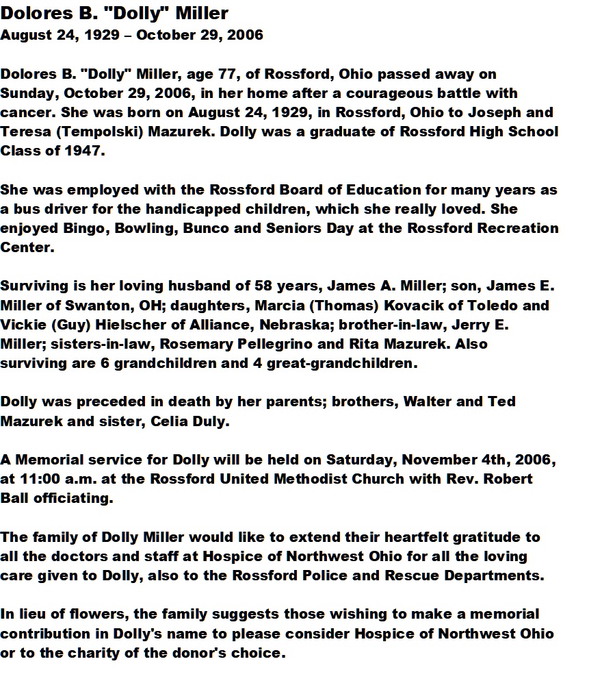 Miller, Dolores - Obituary, Sujkowski Funeral Home, Rossford, OH