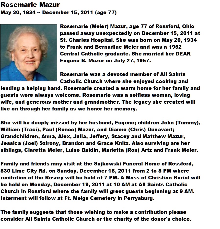 Mazur, Rosemarie - Obituary, Sujkowski Funeral Home, Rossford, OH
