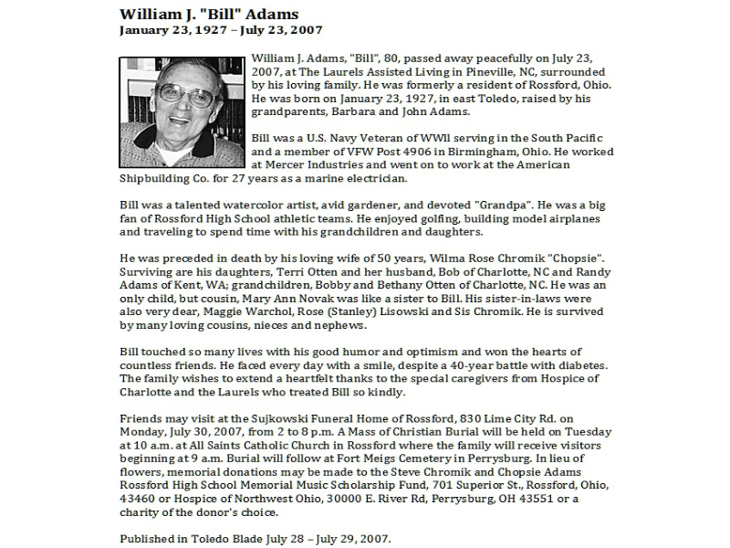 Adams, William, Sujkowski Funeral Home, Rossford, OH Published in Toledo Blade; 07/28-29/2007