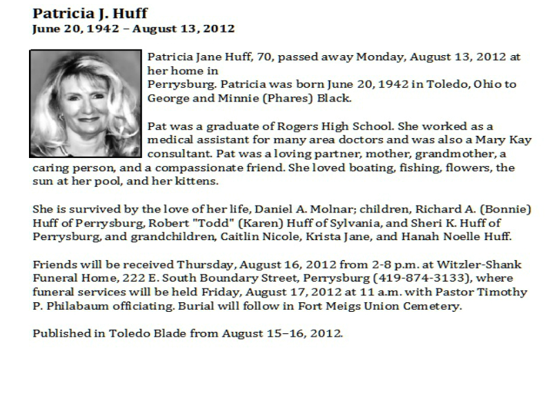 Huff, Patricia, Witzler Shank Funeral Home, Perrysburg, OH Published in Toledo Blade; 08/15-16/2012