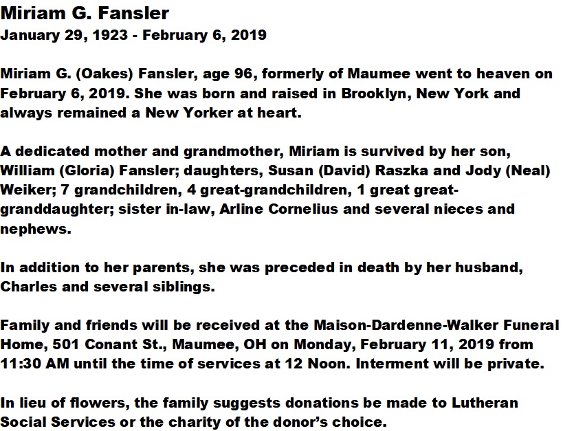 Fansler, Miriam - Obituary, Maison-Dardenne-Walker Funeral Home, Maumee, OH